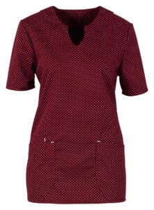 Erhältlich in den Größen XS bis 5XL mit einer Standardlänge von 70 cm bei Größe M. Unser Damenkasack ist in den Farben Weinrot und Marine erhältlich, beide mit einem charmanten weißen Punkt-Muster für einen verspielten, aber professionellen Look.